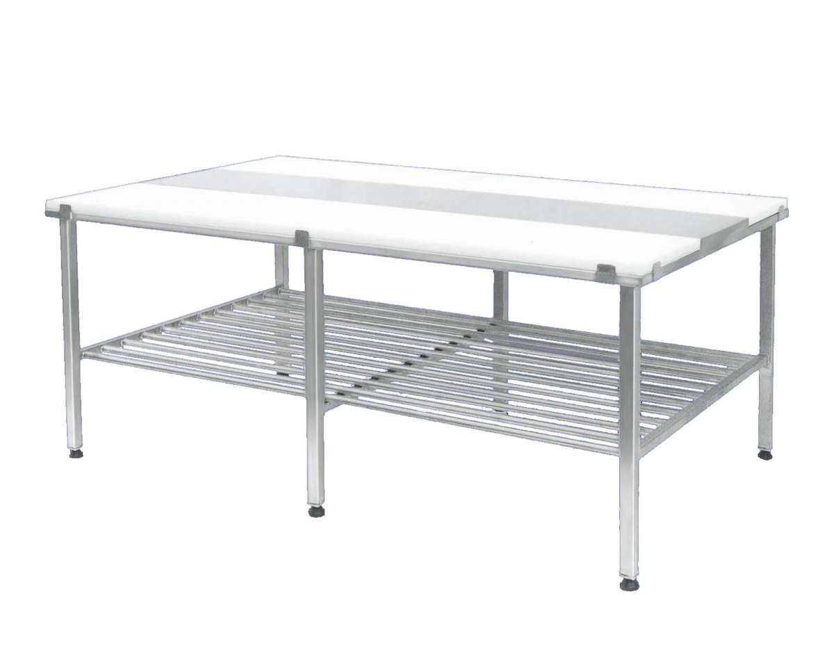 Stainless steel deboning table with exchangeable polyehtylene 500 plates 400 mm, thickness 30 mm, frame 40x40x2 mm, bottom shelf Ø25×2,0 mm, adjustable legs. Table measures